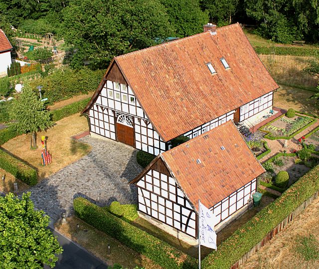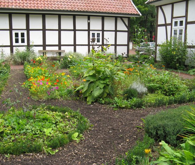 De liefdevol aangelegde vaste plantentuin wordt omringd door twee vakwerkhuizen.